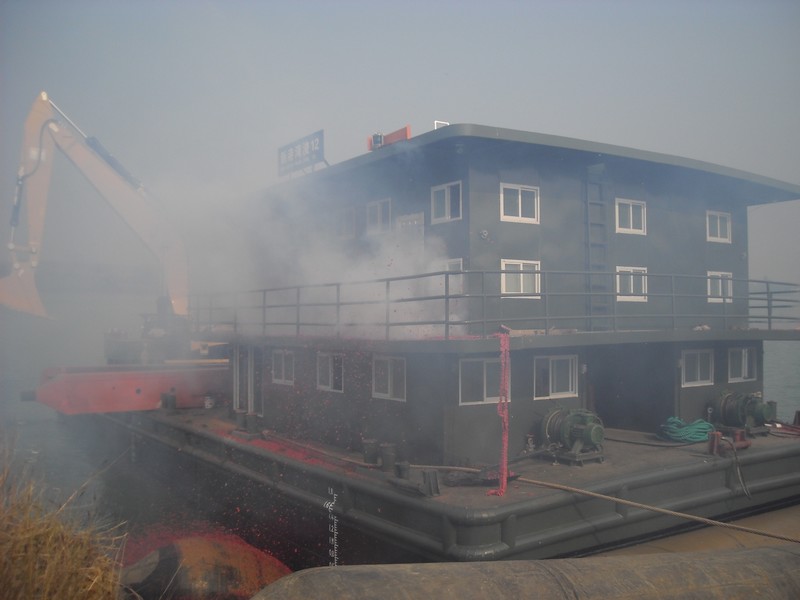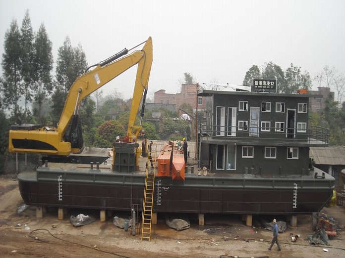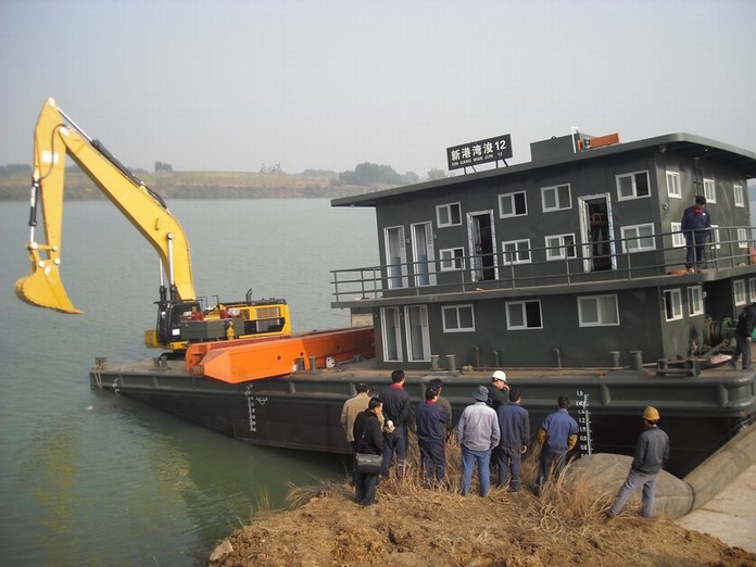 2012年元月10日,由廣西新港灣工程有限公司自行設(shè)計(jì)的反鏟式挖泥船“新港灣浚12”順利下水。該挖泥船的船總長(zhǎng):28.6米、船寬:10.5米、船型深:2.2米、船吃水:1.4米、船上裝配卡特CAT390D挖掘機(jī),功率420KW,斗容4立方米,最大挖深10米。迄今為止,是廣西最大的反鏟式挖泥船。