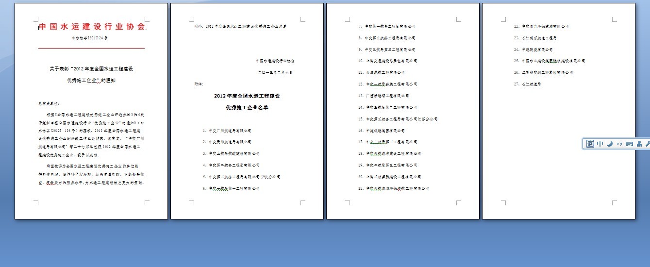 喜訊:我公司榮獲2012年度全國水運(yùn)工程建設(shè)