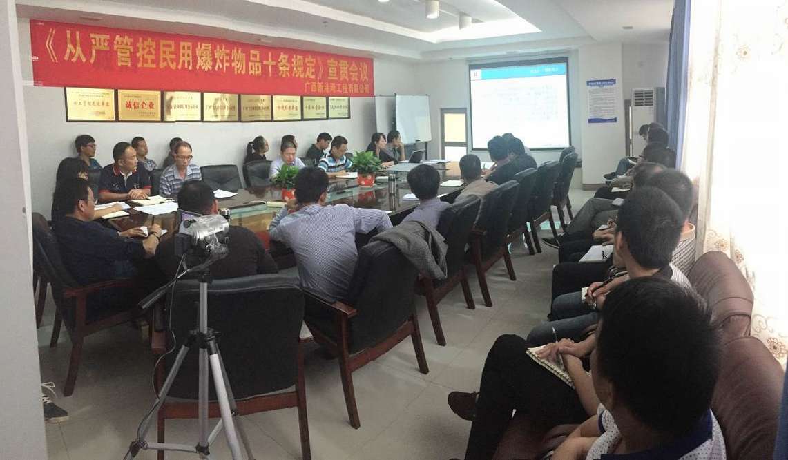 為了落實(shí)自治區(qū)公安廳專項(xiàng)會議要求,汲取柳城“9•30”爆炸案件教訓(xùn),進(jìn)一步加強(qiáng)民用爆炸物品安全管理工作,公司于2015年11月9日組織各部門經(jīng)理、項(xiàng)目經(jīng)理和各炸礁船經(jīng)理,在公司總部會議室召開《從嚴(yán)管控民用爆炸物品十條規(guī)定》宣貫會議,會議主題為“遵守法律法規(guī)、落實(shí)主體責(zé)任、嚴(yán)防涉爆案件、事故”。