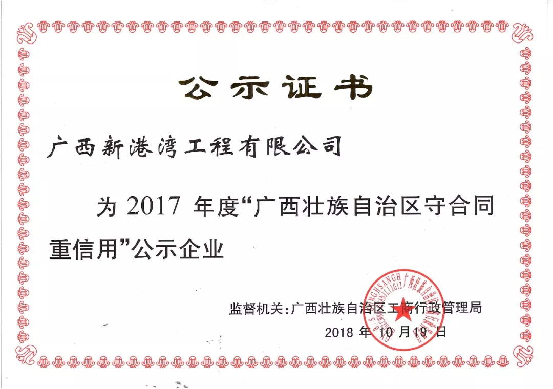 經(jīng)廣西壯族自治區(qū)工商行政管理局評(píng)定,廣西新港灣工程有限公司榮獲“2017年度廣西壯族自治區(qū)守合同重信用企業(yè)”公示。這也是公司連續(xù)多年獲得此榮譽(yù)。