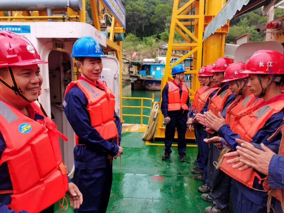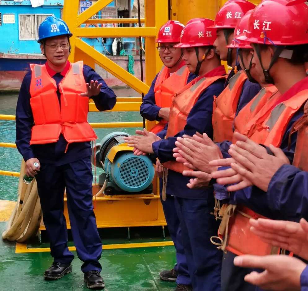 隨后寧董和姚董在項(xiàng)目部管理人員的陪同下來(lái)到新港灣81號(hào)船組,現(xiàn)場(chǎng)慰問(wèn)一線施工人員。寧董和姚董實(shí)地察看航段內(nèi)的施工現(xiàn)場(chǎng),參觀了公司自主設(shè)計(jì)建造的內(nèi)河炸礁船,并與船組同事深入交流探討船機(jī)設(shè)備技術(shù)和施工工藝流程。